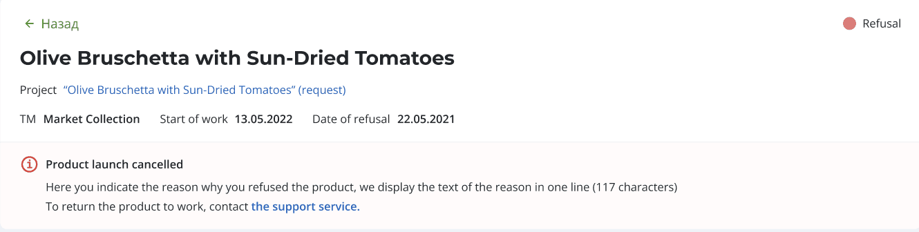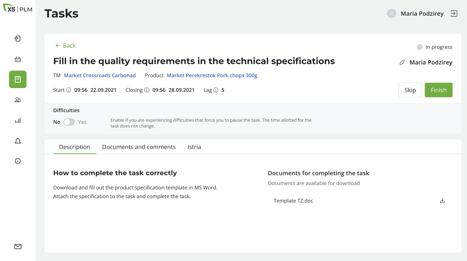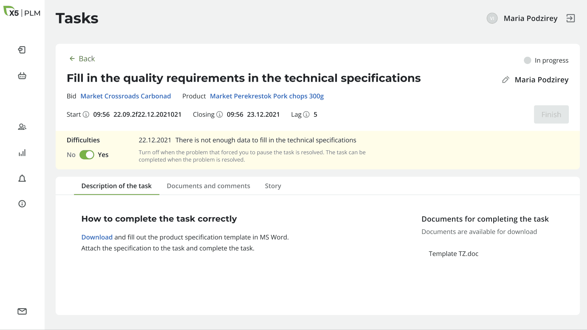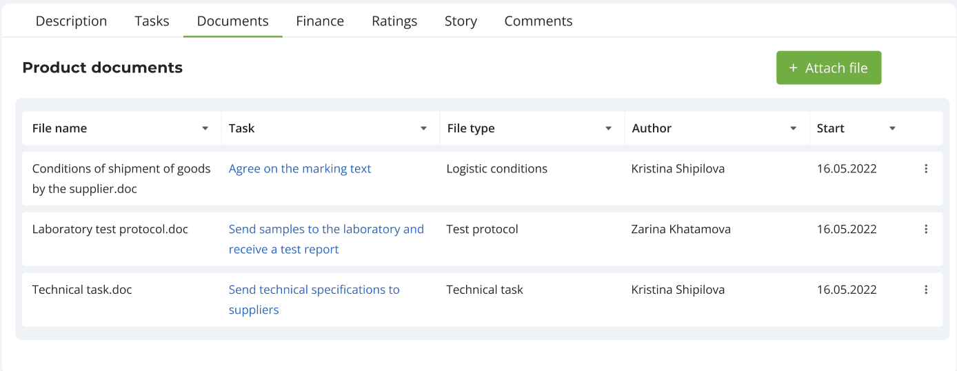 After approving the application, the products from it appear in the system and tasks and those responsible for their implementation are automatically assigned. The task card consists of: