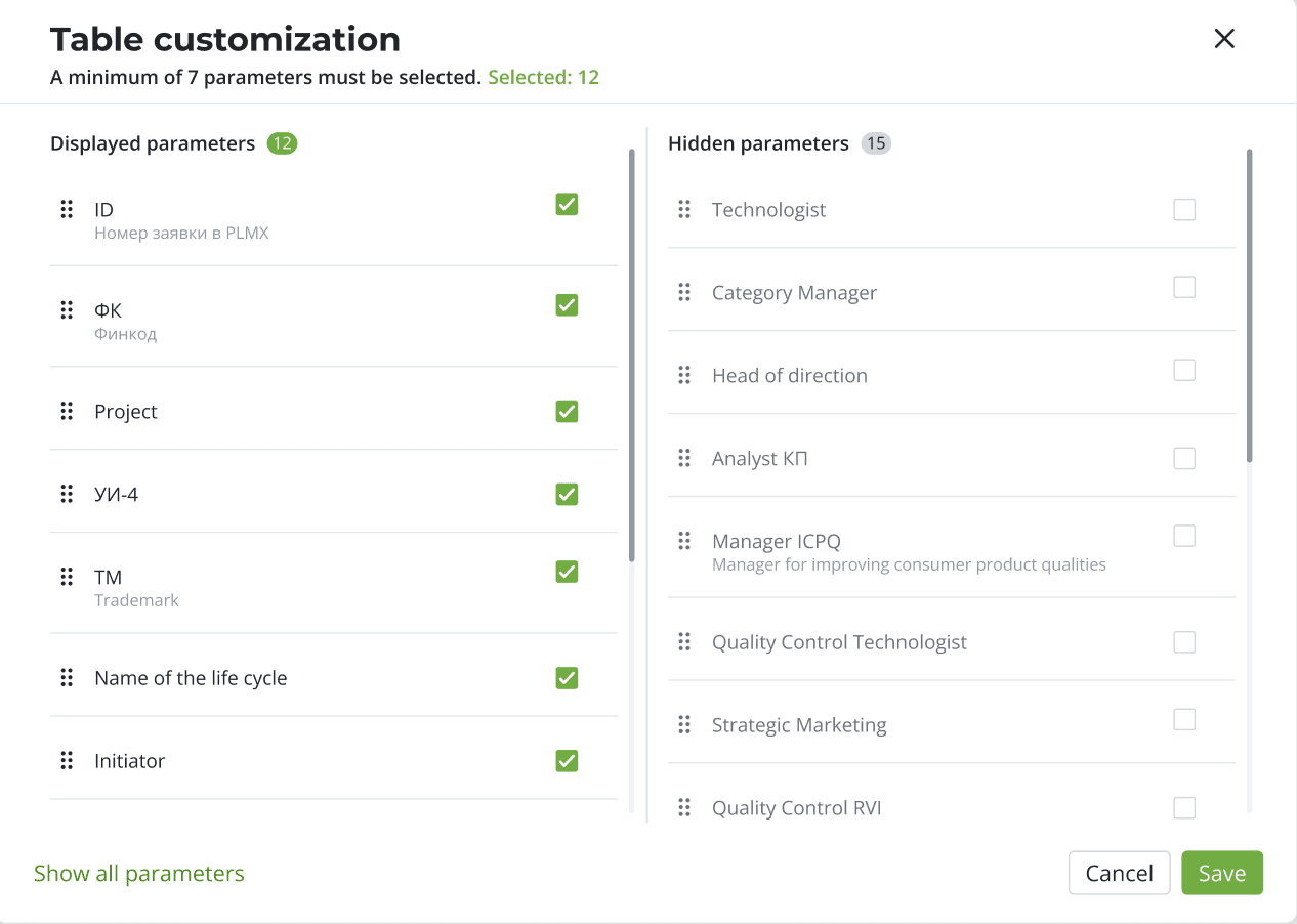 For a long time, users worked only in Excel. Therefore, the main screens of the sections are presented in the form of tables. So that the transition from Excel to the platform was as painless as possible. For ease of use, each table has settings: